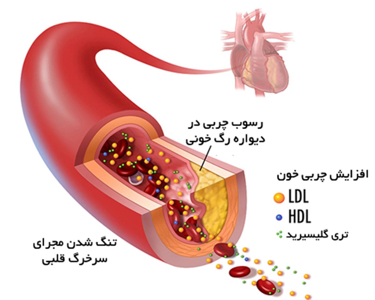 - آترواسکلروز: تنگ شدن عروق به دلیل رسوب چربی